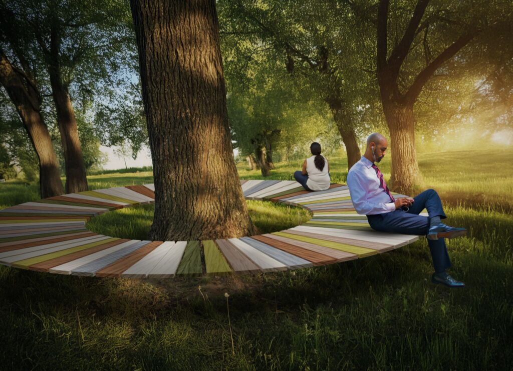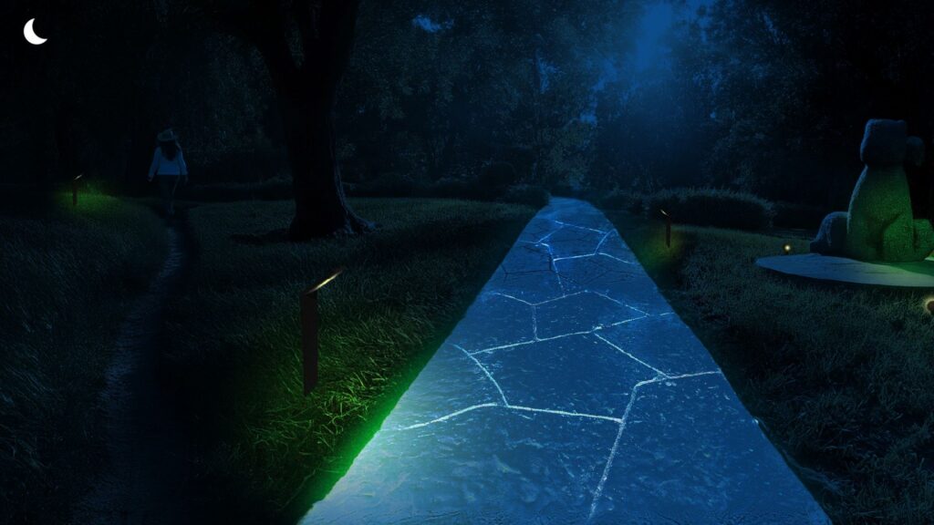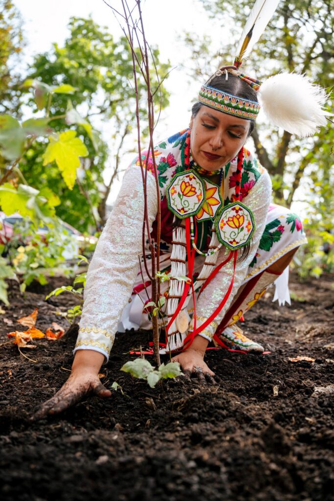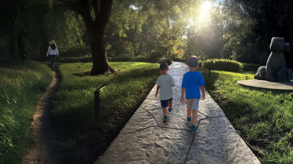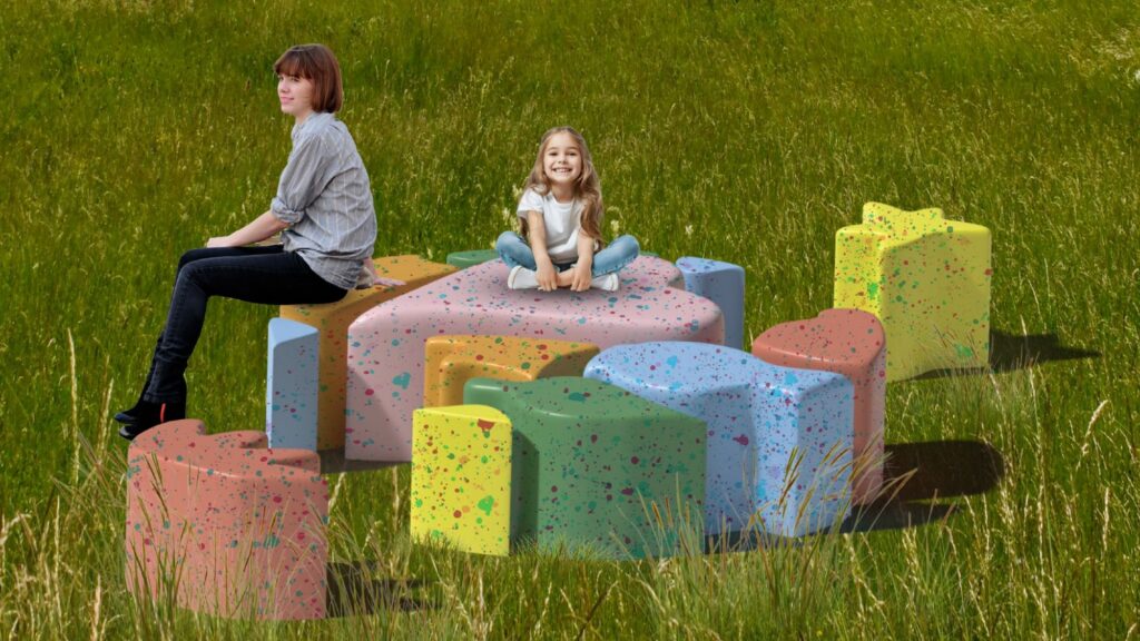 The entire landscape is both gallery and classroom – art and ecology intertwined. A colorful circular bench crafted by a local artist will invite people to sit and gaze upward into the trees, while new sculptural seating made from recycled materials celebrates creativity born from care. Around the site, interpretive signage will guide movement and tell stories: of plants, of people, and of the power of healing land together.